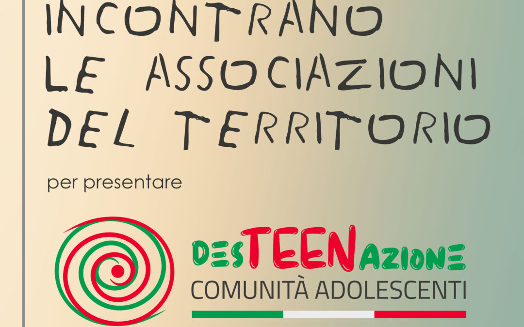 Incontro con le Associazioni 18.11.25 da admin | Nov 14, 2025 | Desteenazione | 0 commenti per presentare il progetto DesTEENazione Invia commento Annulla rispostaIl tuo indirizzo email non sarà pubblicato. I campi obbligatori sono contrassegnati *Commento * Nome * Email * Sito web Salva il mio nome, email e sito web in questo browser per la prossima volta che commento.